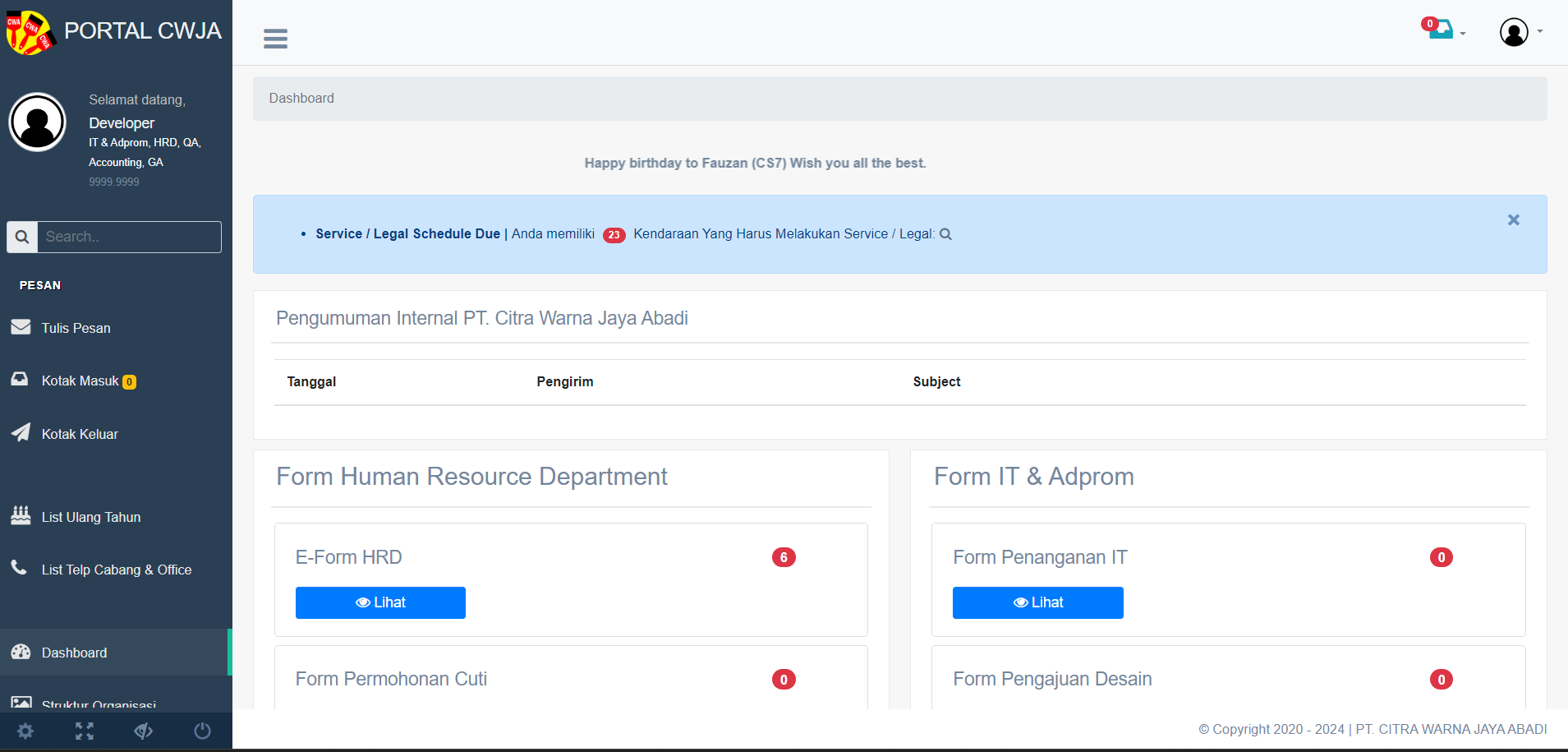 The internal system or called Portal is the internal communication system at PT. Citra Warna Jaya Abadi, with various features in it.